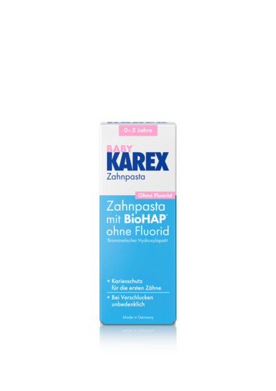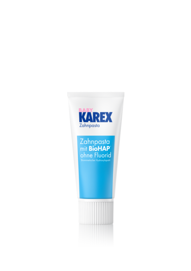 The new BABY KAREX toothpaste is the ideal introduction to daily brushing for our little ones' first teeth. It cleans gently and at the same time effectively protects against tooth decay – with “BioHAP” instead of fluoride.