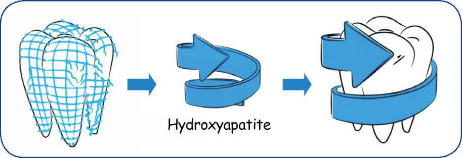 The natural repair mechanism of (initial) carious lesions works by calcium and phosphate ions from saliva repairing enamel defects quickly and effectively. To date, fluoride salts were the substance of choice to improve remineralisation. Fluoride ions cause the ions in the saliva to be integrated more quickly. For exposed dentine, as is the case with exposed tooth necks, the remineralisation potential of fluorides in the administered quantities is negligible. More and more studies show the potential of new biocompatible substances to repair carious lesions. Hydroxyapatite is a promising substance in this regard.